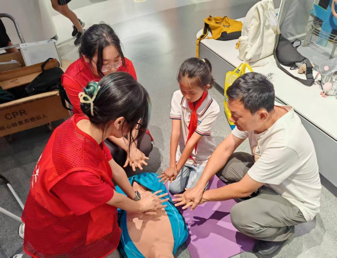 活动以讲解、示范及小组互动的形式为公众普及科学健康知识。期间,郑州大学公共卫生学院的志愿者通过分组示范,为馆内观众讲解并演示海姆立克急救法、心肺复苏等急救措施。活动过程中,小朋友们与志愿者积极互动,主动参与演示,亲身体验急救操作流程,志愿者则对参与体验者的动作进行细致纠正和专业讲解。