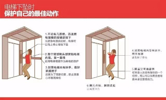 2.自我保护:将整个背部和头部紧贴梯箱内壁,用电梯壁来保护脊椎。同时下肢呈弯曲状,脚尖点地、脚跟提起以减缓冲力。用手抱颈,避免脖子受伤。