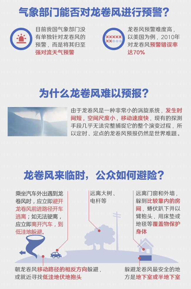 “防御龙卷风,需要多关注气象局发的天气预报。从19世纪以来,天气预报的准确性大大提高,气象雷达已经能够监测到龙卷风,并及时发出龙卷风警报。对此,大家应该密切关注天气预报,一旦收听到龙卷风预报和警报,立即采取措施防范灾害。”气象专家说。