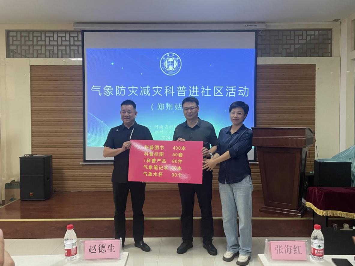 活动当天,省科协科普部副部长赵德生、省气象局学会秘书处副秘书长赵斐苗共同上台为社区捐赠科普图书、《社区气象灾害避险指南》画册、气象科普挂图等系列科普产品590件。