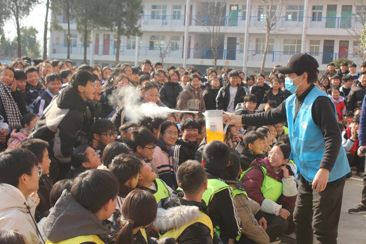 本次科普活动精心设置了八大展区,分别为智能机器人表演、无人机展示、科学实验秀、科教展品体验、科普谜语竞猜、反邪教宣教签名、科普小发明互动及科普影片展映。智能机器人表演区中,宇树机器人G1与机器狗GO2Pro联袂登场。随着指令下达,机器人翩翩起舞,动作精准流畅、独特灵动,其中“旋风三连踢”表演引得阵阵欢呼。机器狗现场与同学们进行赛跑,让大家近距离感受到科技赋予机器的灵动与活力;无人机展示区内,在工作人员的操纵下无人机接连升空,时而急速攀升,时而悬停翻转,灵活高效完成指令动作。工作人员同步介绍其在农业植保、应急救援等领域的实际应用,使师生更深入理解技术服务于社会生活的现实价值;科学实验秀中干冰实验营造出“腾云驾雾”的奇幻效果,“火焰掌”炫酷生动,面粉爆炸惊险震撼,引发现场阵阵惊叹;科普小发明互动区陈列了涵盖力学、电学等多个领域的展品。将抽象的科学知识转化为实际的互动体验;多媒体教室开展的“光影科学梦”科普影像展播,通过真实记录科学家们的奋斗事迹,鼓励同学们保持好奇心,激发探索欲。活动中还向师生赠送了科普读物,进一步延伸科普触角,让科学的种子在课堂之外继续生根发芽。