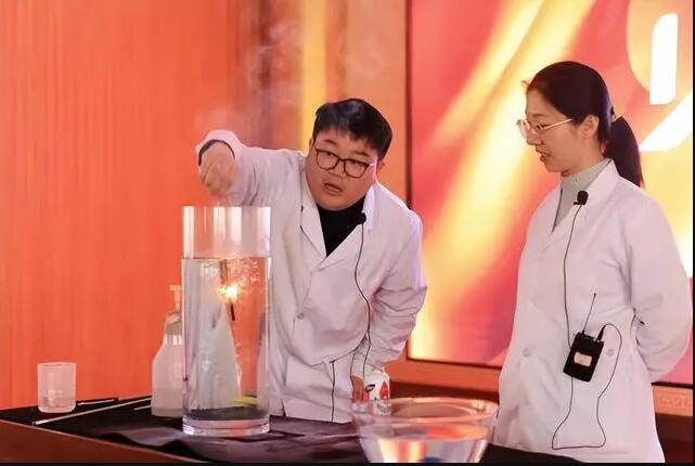 活动过程中,郑州科技馆两位科学老师以中国古代神话《封神榜》为背景,以“火”为线索向现场同学们展示了燃烧的风火轮、水下烟花、三昧真火、火焰掌等实验,带领大家一起探究火焰的科学原理。整个活动过程中,郑州科技馆科学老师母佰明、杨茸惠以诙谐幽默的表演风格,通过“展示+互动”的演绎方式,开启了一场科学奥秘的探索体验之旅,激发了现场的同学们极高的兴趣和热情,同时通过亲手参与实验,感受到了科学的魅力,体验了丰富的科学现象。