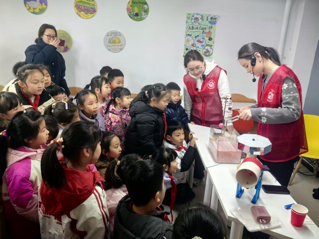 声音的产生与传播科普演示同样引人入胜。志愿者通过音叉实验、声波可视化展示等方式,将抽象的声学原理变得直观可感,孩子们看到音叉振动时水面产生的波纹,听到不同长度空气柱发出的音调变化,感受亲手敲击物体产生的变化,在互动体验中理解了声音如何产生、怎样传播等。
